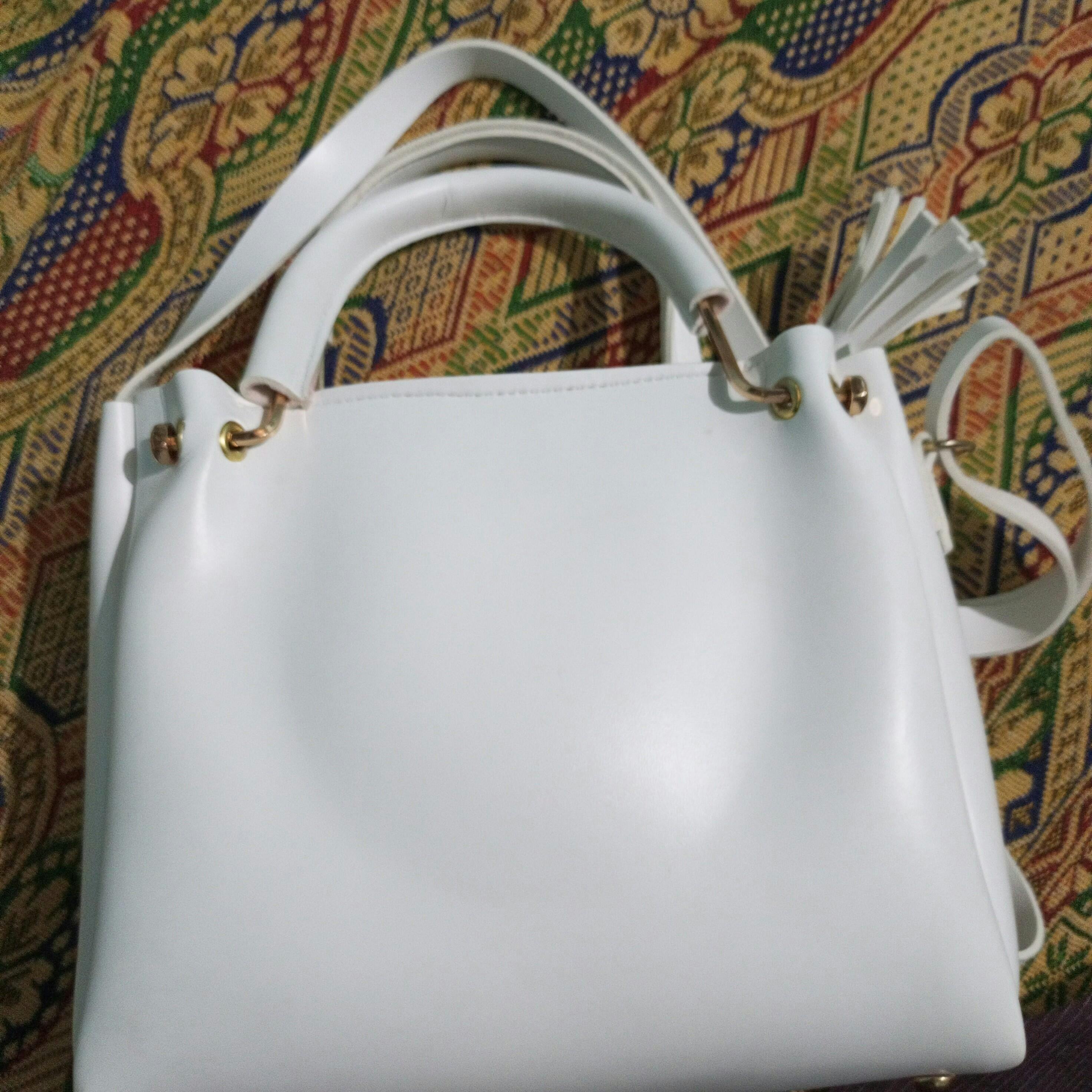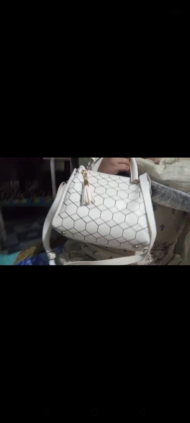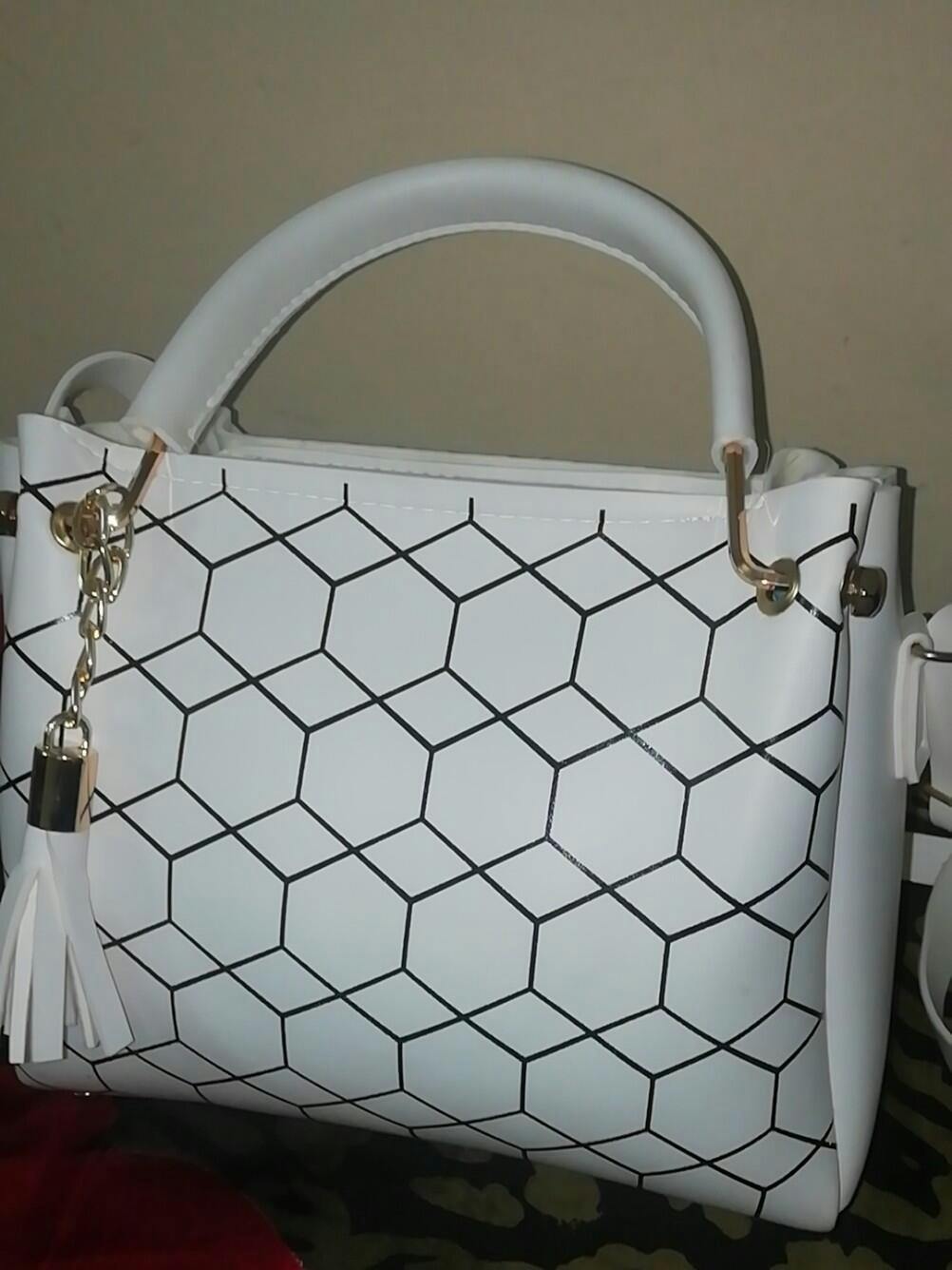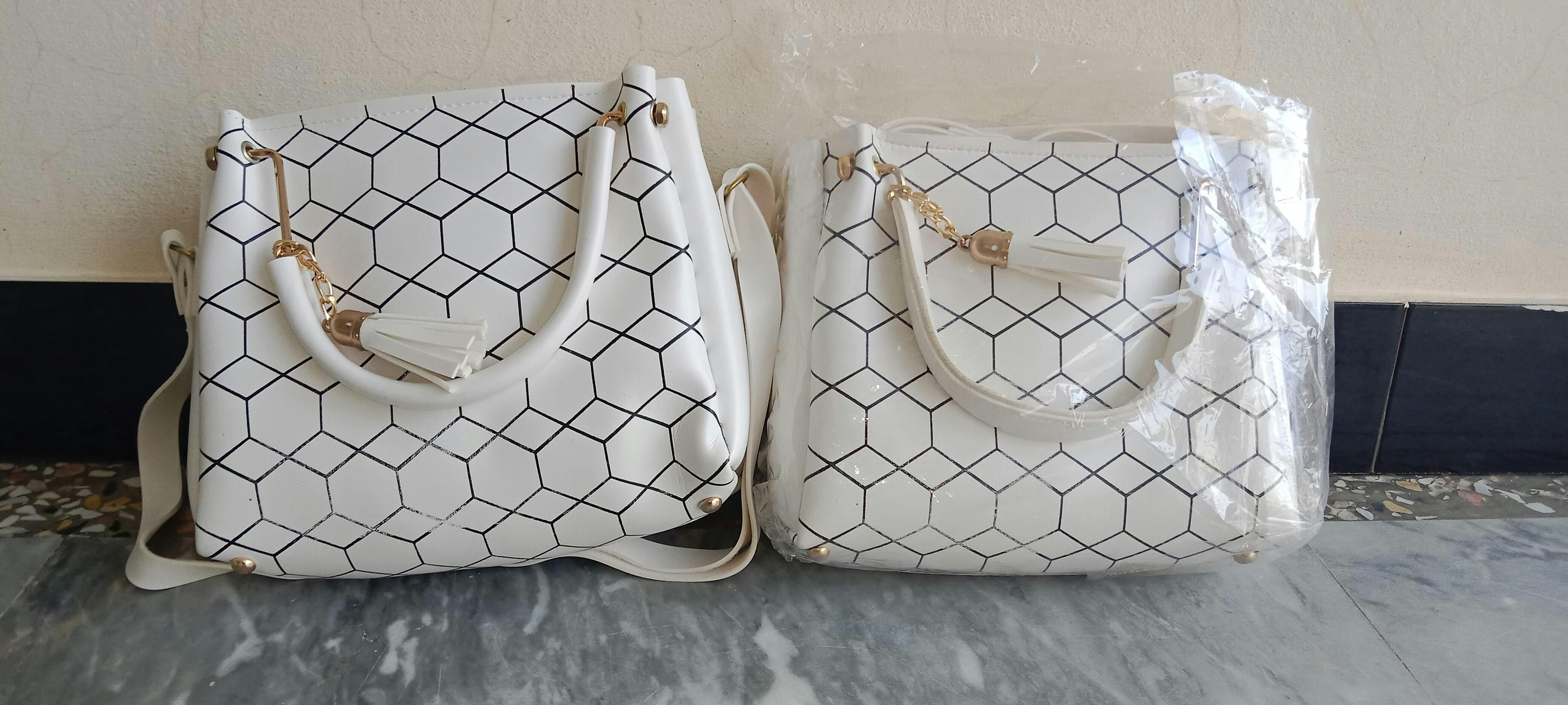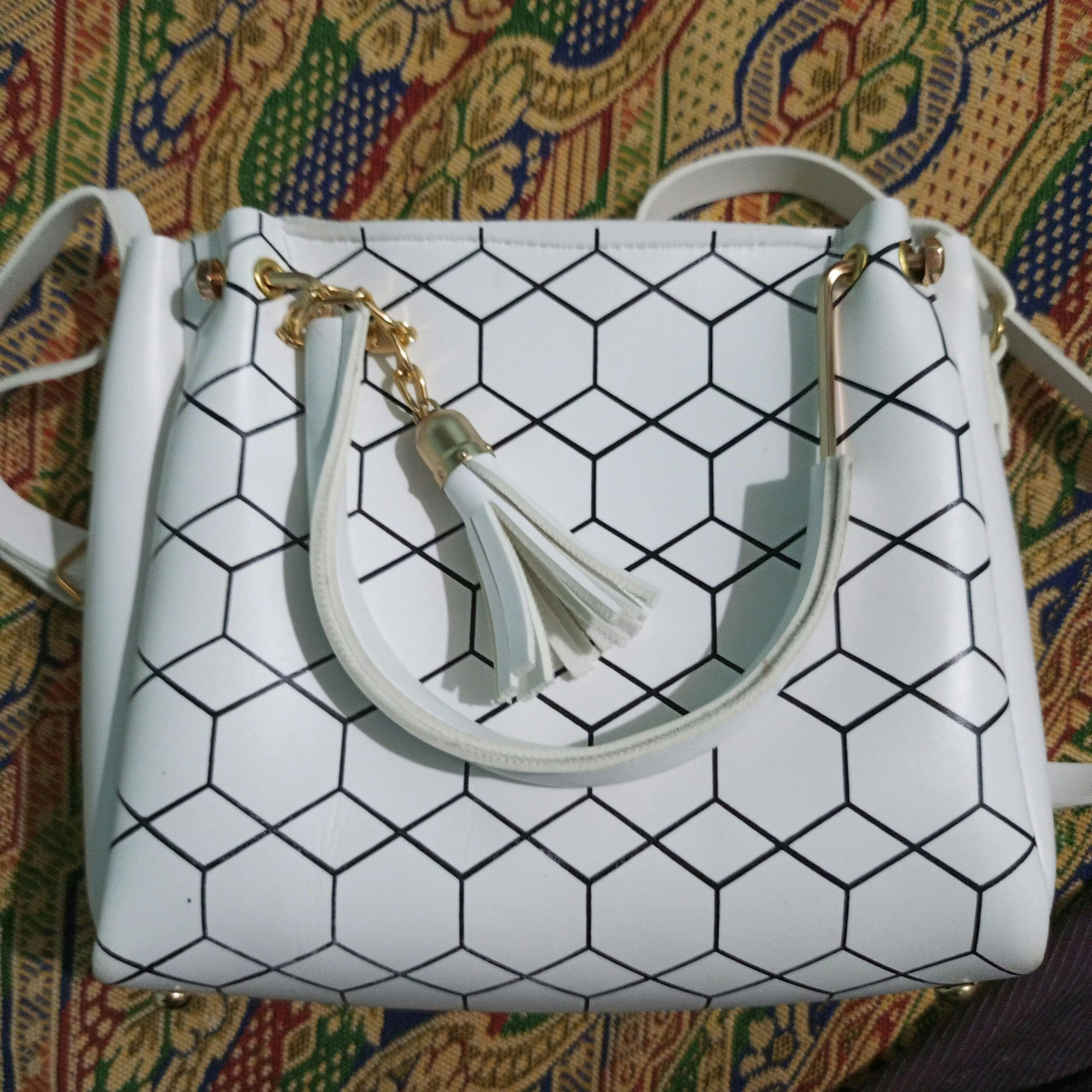 Upgrade your style with this chic handbag featuring a modern geometric pattern and a sturdy metal handle for a premium look. Designed with both top handles and a detachable shoulder strap, it offers versatile carrying options. The bag is adorned with a classy tassel charm, adding a fashionable touch. Perfect for casual outings, parties, or office use, this handbag combines elegance with practicality.